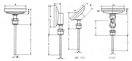 3、135°向型雙金屬溫度計:指針盤與保護管成135°連接;